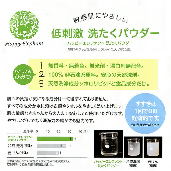 ハッピーエレファント 洗たくパウダーHappy Elephant LAUNDRY Powder 45g×5洗剤のサラヤと寝具のマニフレックスが共同で企画。