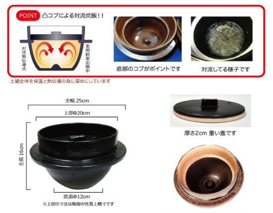 内底部に凸部分をつけることで熱が対流してお米が踊りながら加熱され、陶器釜特有の「遠赤外線効果」「保温」「湿り気調節」「加熱中に蓋が開けられる」などでピッカピカに輝く、しっとりと美味しい「ごはん」に炊き上がるのです。