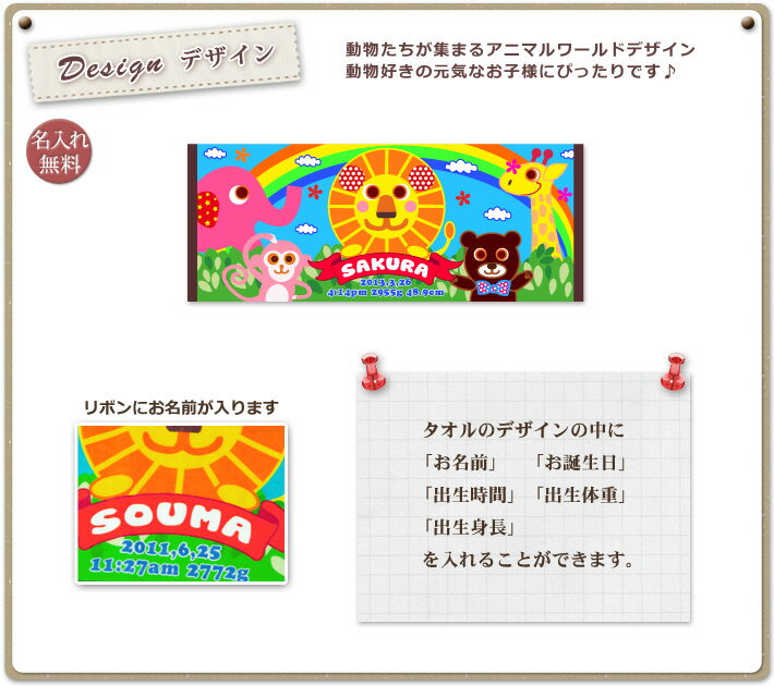既製品に刺繍する名入れではなく、タオルのデザインにお名前が入る本格的なオリジナルギフトです。
