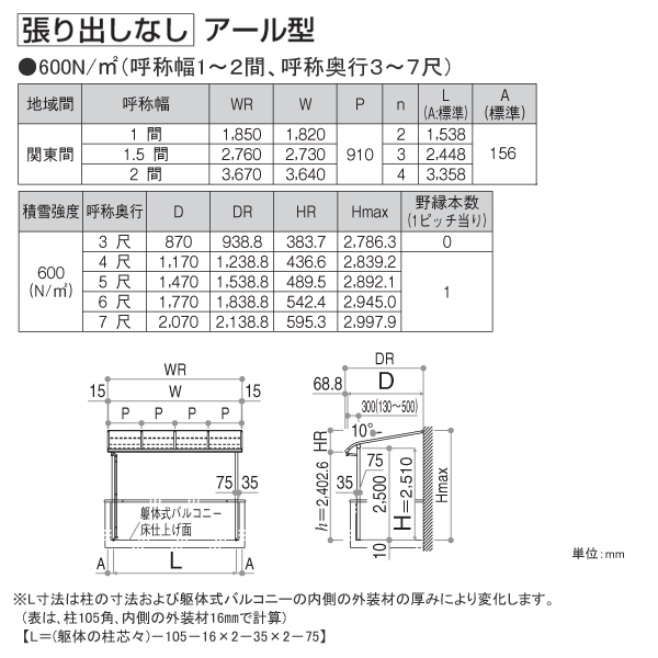 メーカー希望小売価格はメーカーカタログに基づいて掲載しています メーカー希望小売価格確認はこちらヴェクター 躯体式バルコニー屋根 サイズ表 600N/m2 柱奥行移動タイプ 関東間 屋根材:ポリカーボネート (横列寸法:屋根奥行) 屋根幅 屋根形状 870mm1170mm1470mm1770mm2070mm 1.0間(1850) アール 3尺 4尺 5尺 6尺 7尺 フラット 3尺 4尺 5尺 6尺 7尺 1.5間(2760) アール 3尺 4尺 5尺 6尺 7尺 フラット 3尺 4尺 5尺 6尺 7尺 2.0間(3670) アール 3尺 4尺 5尺 6尺 7尺 フラット 3尺 4尺 5尺 6尺 7尺 600N/m2 柱奥行移動タイプ 関東間 屋根材:熱線遮断ポリカーボネート (横列寸法:屋根奥行) 屋根幅 屋根形状 870mm1170mm1470mm1770mm2070mm 1.0間(1850) アール 3尺 4尺 5尺 6尺 7尺 フラット 3尺 4尺 5尺 6尺 7尺 1.5間(2760) アール 3尺 4尺 5尺 6尺 7尺 フラット 3尺 4尺 5尺 6尺 7尺 2.0間(3670) アール 3尺 4尺 5尺 6尺 7尺 フラット 3尺 4尺 5尺 6尺 7尺