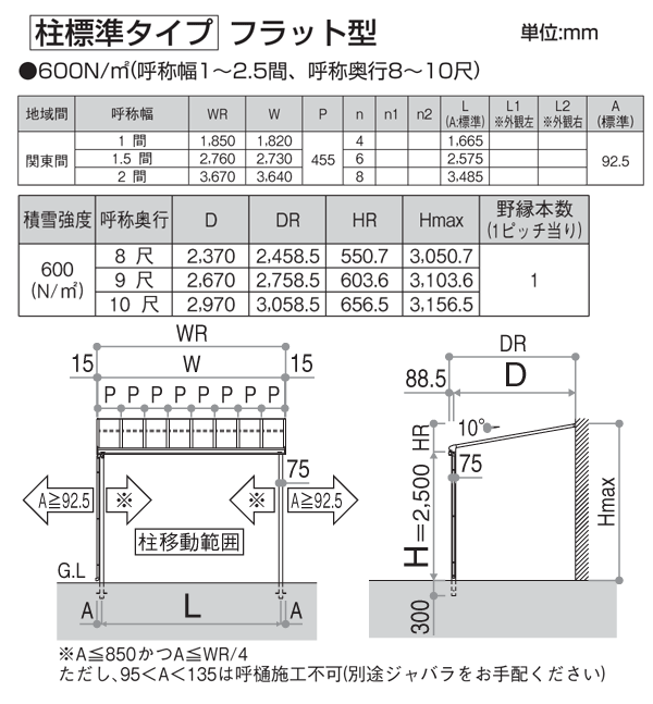 仕 様注意点 【仕様】1階設置用・600N/m2・柱標準タイプ・関東間 (柱の位置が間口方向に移動できます。